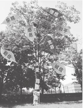 從某種意義上說(shuō),人的成長(zhǎng)與樹(shù)的生長(zhǎng)有相似之處。因此,我們用一棵樹(shù)來(lái)表示十個(gè)基本的價(jià)值品質(zhì)的關(guān)系。我們把樹(shù)分為樹(shù)干和左、右三部分,把十個(gè)基本價(jià)值品質(zhì)也大致分為三組,其中以“尊重”與“責(zé)任”為核心。設(shè)計(jì)這棵樹(shù)的靈感源自種植于我校校園內(nèi)的天津經(jīng)濟(jì)技術(shù)開(kāi)發(fā)區(qū)的第一棵樹(shù),因此,這個(gè)設(shè)計(jì)也具有濃郁的地方特色和深刻的象征意義。