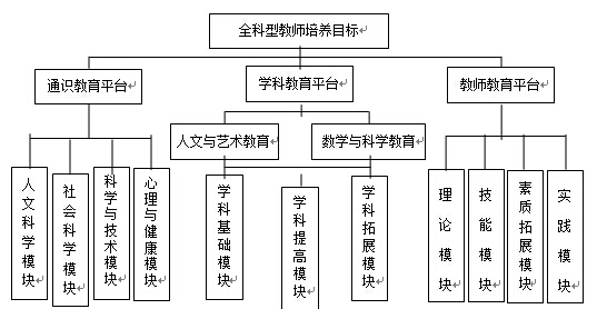 在學(xué)科教育平臺(tái)的設(shè)計(jì)上,突出能力教育為主體,將全科型教師的學(xué)科教育分為相輔相成的兩個(gè)階段。其中,以人文教育為主的教學(xué)方向,前兩年以人文與社會(huì)科學(xué)概論為基礎(chǔ),以人文社會(huì)科學(xué)史綱、藝術(shù)發(fā)展史為輔助,側(cè)重對(duì)漢語(yǔ)言文學(xué)、思想政治教育、歷史學(xué)、地理科學(xué)和藝術(shù)的學(xué)習(xí),以達(dá)到對(duì)人和社會(huì)的總體認(rèn)識(shí),并通過(guò)藝術(shù)學(xué)習(xí)陶冶情操;以數(shù)學(xué)和科學(xué)教育為教學(xué)方向,前兩年則以自然科學(xué)概論為基礎(chǔ),以自科學(xué)技術(shù)史為輔助,側(cè)重對(duì)數(shù)學(xué)、物理、化學(xué)、生命科學(xué)和地學(xué)的學(xué)習(xí),以達(dá)到對(duì)自然的總體認(rèn)識(shí)。從第五學(xué)期開(kāi)始,各個(gè)方向則根據(jù)學(xué)生個(gè)性發(fā)展的要求,自主選擇分領(lǐng)域的深入學(xué)習(xí)與研究。開(kāi)設(shè)雙語(yǔ)教學(xué)課程,拓寬全科型教師的國(guó)際視野,適應(yīng)我國(guó)農(nóng)村發(fā)展、城鎮(zhèn)化建設(shè)和對(duì)外開(kāi)放的文化發(fā)展需要。