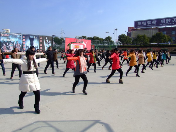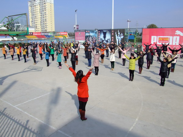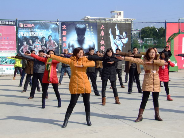 雖然籃球場上風很大,天很冷,但教師們卻沒有絲毫畏縮,一如在課堂上全身心投入工作的態(tài)度,認真學習每一個動作。經過上下午兩個多小時的學習,絕大部分教師都能跟上節(jié)拍,獨自完成動作。