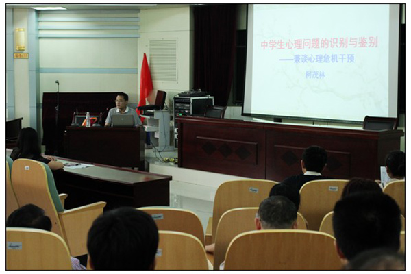 隨后,柯茂林博士深入淺出、圖文并茂地分析了中學(xué)生心理問(wèn)題的識(shí)別與鑒別的重要作用。在講座中,他針對(duì)當(dāng)前中學(xué)生普遍出現(xiàn)的一些心理問(wèn)題進(jìn)行理論聯(lián)系實(shí)際的講解。對(duì)于我們常說(shuō)的“早戀”,柯博士分析其實(shí)很多的時(shí)候只是配對(duì)活動(dòng),對(duì)這類問(wèn)題上策是疏而不堵??虏┦窟€幫我們區(qū)分了“網(wǎng)癮”與網(wǎng)絡(luò)不當(dāng)使用,他認(rèn)為辯證思維和親情維護(hù)是對(duì)付網(wǎng)絡(luò)不當(dāng)使用的兩大法寶。而對(duì)自卑、抑郁心理的識(shí)別柯博士用了一個(gè)生動(dòng)的案例告訴老師們應(yīng)以家庭為切入點(diǎn)來(lái)體現(xiàn)呵護(hù)和關(guān)懷,更提醒我們關(guān)注“好孩子綜合癥”。中學(xué)生臨考常有的焦慮心理的問(wèn)題上,他主張治療家庭焦慮是關(guān)鍵,必要時(shí)尋求專業(yè)幫助。而對(duì)于較為嚴(yán)重的精神病性心理,他分析了其常見跡象,并給出建議:細(xì)心觀察細(xì)節(jié)征兆并及早就醫(yī)。