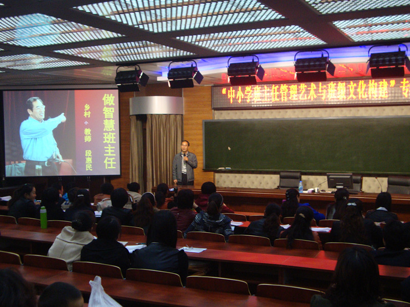 會(huì)議期間,“河南省師德先進(jìn)個(gè)人”、“ 全國(guó)十佳班主任”段惠民老師做了《追求教師職業(yè)幸?!返难葜v;“全國(guó)模范教師”、“全國(guó)優(yōu)秀班主任”郭玉良老師做了《來自心靈的呼喚—問題學(xué)生的教育策略》的主題報(bào)告;“全國(guó)優(yōu)秀班主任”張勝利通過《班級(jí)主流文化的魅力》向老師們暢談如何構(gòu)建班級(jí)文化和班級(jí)文化的力量,并展示了一節(jié)別開生面的示范班會(huì)課供老師們觀摩。他們通過生動(dòng)幽默、充滿激情的語言,運(yùn)用理論與實(shí)際相結(jié)合的方式,在如何做一個(gè)幸福、快樂、有成就的班主任、如何創(chuàng)建特色班級(jí)文化、如何促進(jìn)孩子們的成長(zhǎng)、如何提升職業(yè)幸福感等內(nèi)容進(jìn)行了詳細(xì)闡述,并將自己多年來的班主任工作經(jīng)驗(yàn)和心得與在場(chǎng)的班主任進(jìn)行了交流分享,指導(dǎo)大家要認(rèn)真學(xué)習(xí)并研究班級(jí)管理藝術(shù),促進(jìn)學(xué)生養(yǎng)成良好的心理品質(zhì)。