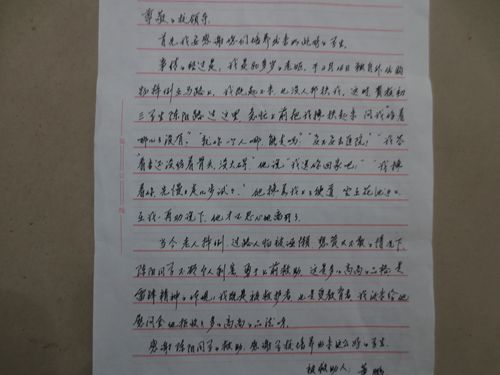 這件事發(fā)生在2月16日,也是開學的第一天,這天初三(3)班陳陽同學到學校報到,大約十點鐘左右放學回家,放下書包,準備去物美超市買東西,走出大院門口,穿過一條馬路,突然,看見一位老奶奶摔倒在地上,周圍有許多人,沒見一個人扶,他趕忙上前,慢慢的把老奶奶扶起來,看見老奶奶額頭蹭破的皮,急忙詢問老奶奶有沒有事,并要求給老奶奶送到超市,奶奶說:“我沒事,我自己能走,謝謝你!”看見奶奶眼里含著感激的淚花,他還是決定將奶奶送到超市,走了大約20多米遠,奶奶說走累了,并要求休息,于是就把奶奶扶到了臺階上坐著,于是奶奶就讓他走,他便很牽掛離開了。