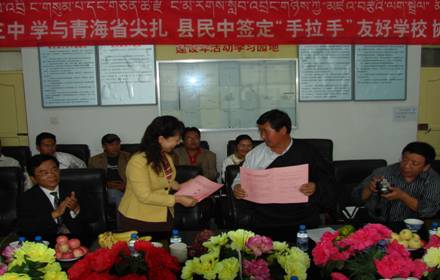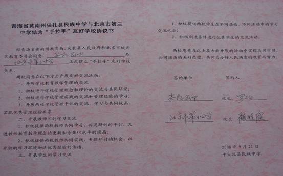 2008年9月16日,北京三中校長顧曉霞,副校長宋學智,副校長周安民,教學主任陳淑萍一行四人遠赴青海省黃南州尖扎縣參加北京三中與尖扎縣民族中學“手拉手”友好學校的簽約活動。 此行受到了尖扎縣民族中學全體師生的高度重視,熱烈歡迎和盛情款待。
