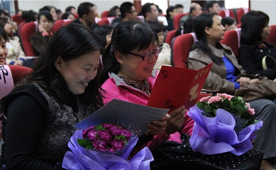 22日下午4時40分,我校第二屆班主任節(jié)在初中部學(xué)生稚嫩而飽含深情的配樂詩朗誦中拉開了帷幕,校合唱隊也獻上了精心準備的歌曲《每當我走過老師的窗前》,高二學(xué)生于小晴代表全體學(xué)生向各位班主任表示感謝。令每一位班主任意想不到的是:每一個班級都有學(xué)生代表來到了現(xiàn)場,獻上了親手制作的賀卡和溫馨的祝福。