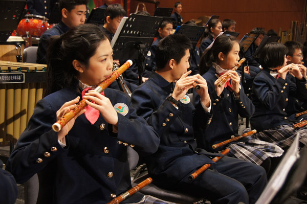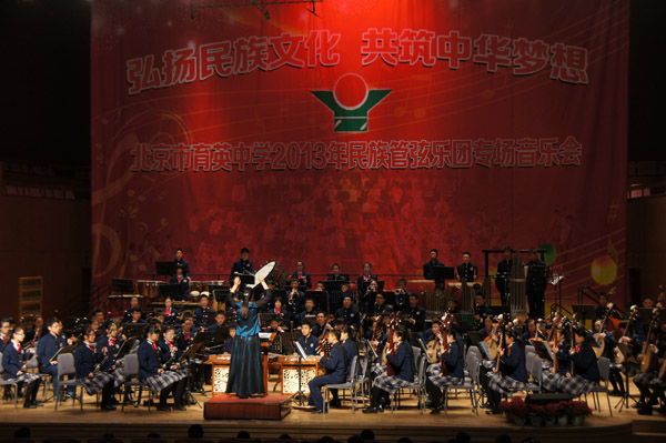 2013年12月20日下午,育英中學金帆民樂團在軍樂團音樂廳舉行了以“傳承民族文化,共筑中華夢想”為主題的專場音樂會。本場音樂會歷時一個半小時,共演奏了8首民樂合奏曲。區(qū)教委領(lǐng)導、兄弟學校領(lǐng)導、共建單位來賓以及家校委會成員、樂團學生家長同我校師生共同欣賞了音樂會。