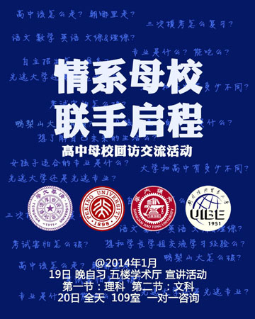 本著向母校的學(xué)弟學(xué)妹們解答高中生活中遇到的學(xué)習(xí)及心理方面的問(wèn)題以及簡(jiǎn)要介紹大學(xué)生活的目的,我們“情系母校,聯(lián)手啟程”聯(lián)合活動(dòng)組將于2014年1月19日、20日分兩天在兵團(tuán)二中高中部舉行交流活動(dòng)。主要活動(dòng)內(nèi)容有: