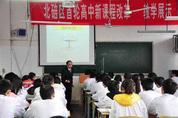2013年11月6日,重慶市北碚區(qū)首輪高中新課程改革總結(jié)會(huì)在重慶市江北中學(xué)順利召開。本次大會(huì)由“成果展示、課堂觀察、小組研討、論壇交流、專家點(diǎn)評和領(lǐng)導(dǎo)講話”六個(gè)部分組成。與會(huì)的專家、領(lǐng)導(dǎo),首先是深入課堂一線,認(rèn)真觀察由北碚區(qū)八所高完中所提供的語文、數(shù)學(xué)、音樂等8堂不同學(xué)科的課堂。