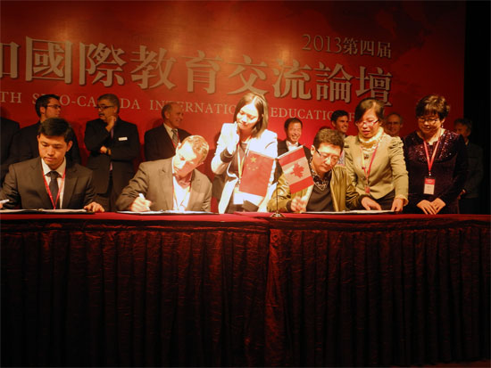 會議的最后一個議程是一些中國著名中小學(xué)與加拿大部分教育局簽訂了合作協(xié)議,黃興力校長與加拿大BC省歌摩士谷教育局、溫哥華公立教育聯(lián)盟簽訂了三方合作協(xié)議,擬將在國際部開設(shè)中加國際班。招收初2014級初中畢業(yè)生,在高中進行一年的國內(nèi)學(xué)習(xí),在高二、高三階段就讀加拿大BC省歌摩士谷教育局所屬的公立學(xué)校,住宿于當?shù)貎?yōu)秀的家庭中,在加拿大參加高考,報考美國、加拿大、澳大利亞等國大學(xué)。這將對我校教育國際化起到積極的推進作用,使學(xué)校的教育國際化更上一個臺階。