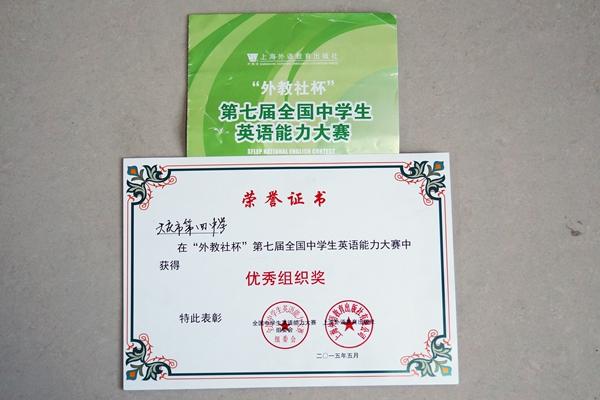 我校外語組獲得“外教社杯”第七屆全國中學生英語能力大賽“優(yōu)秀組織獎”榮譽,受到組委會表彰,在此學校對外語組的工作也予以表彰。