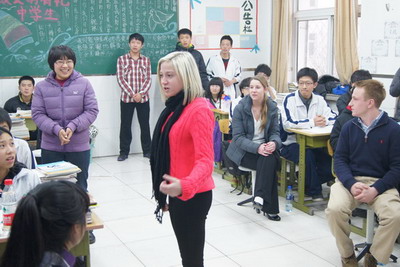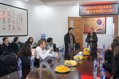 在學(xué)校會(huì)議室,王華副校長(zhǎng)代表學(xué)校對(duì)遠(yuǎn)方朋友的到來表示了熱烈的歡迎,并簡(jiǎn)單介紹了學(xué)校的基本情況和辦學(xué)特色。美國(guó)大學(xué)生也就學(xué)校課程設(shè)置、師資配備、學(xué)生活動(dòng)等問題與學(xué)校領(lǐng)導(dǎo)進(jìn)行了交流。