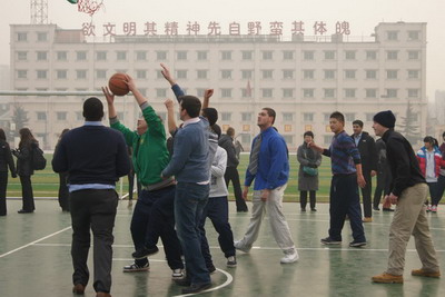 此次參加訪問的大學(xué)生來自布萊恩特大學(xué)二年級(jí)。在參觀校園的過程中,10幾名美國(guó)大學(xué)生興致盎然地與正在上體育課的高一年級(jí)同學(xué)進(jìn)行了一場(chǎng)10分鐘的籃球比賽。幾名老師和同學(xué)還與高一同學(xué)們踢起了足球。