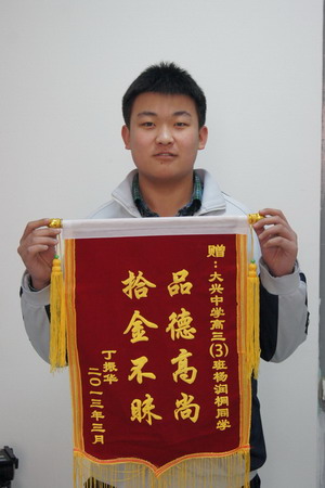 拾金不昧是中華民族的傳統(tǒng)美德,也是一個人良好道德風(fēng)尚和崇高社會責(zé)任感的具體體現(xiàn)。2013年3月的一個清晨,我校高三(3)班楊潤桐同學(xué)在上學(xué)的路上撿到一個錢包,內(nèi)有幾千元現(xiàn)金以及身份證、數(shù)張銀行卡等物品,他第一時間將錢包交到了就近轄區(qū)派出所,在民警同志的幫助下,找到了失主,并婉言拒絕了失主的感謝。失主丁振華先生非常感動,特意來到學(xué)校,送來了感謝信和錦旗。