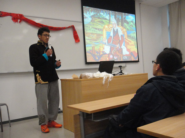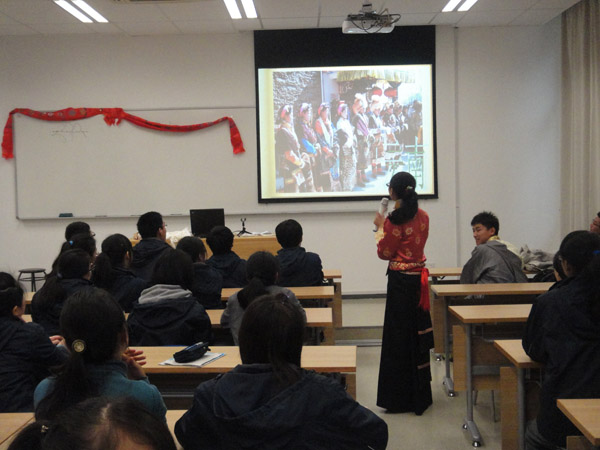 2014年2月25日中午,旦華樓一樓視頻會(huì)議室內(nèi)座無(wú)虛席,為了在藏族新年來臨之際讓附中學(xué)子們更深入地了解藏族文化,會(huì)議室里正在舉辦由藏班同學(xué)們自己編排的藏族課程。身著藏族服飾的藏班同學(xué)們化身“講師”,一個(gè)個(gè)登臺(tái)亮相,介紹了西藏從古至今的發(fā)展歷程,以及藏族美食,藏族語(yǔ)言文字,藏族風(fēng)俗等同學(xué)們非常感興趣的話題。課程最后,臺(tái)下的同學(xué)們也參與進(jìn)來,紛紛在黑板上學(xué)習(xí)寫藏文,會(huì)議室里一片溫馨祥和的景象。小“講師們”用滔滔不絕的精彩演講詮釋了他們對(duì)藏文化至深的熱愛。在他們身上,我們看見了滿滿的民族自豪感。
