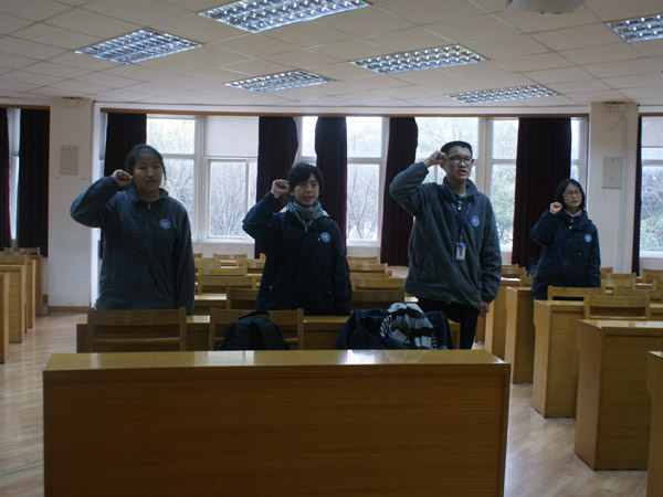 與會團員們對申請人進行了討論,一致通過了他們的入團申請。面對著鮮艷的團旗,各位批準入團的同學(xué)在領(lǐng)誓人的引導(dǎo)下舉起右拳,莊嚴宣誓,樹立了“為共產(chǎn)主義事業(yè)而奮斗”的遠大目標(biāo),正式成為了團員,并加入了復(fù)旦大學(xué)附屬中學(xué)團支部。宣誓完畢,在場的同學(xué)對他們表示了衷心的祝賀。