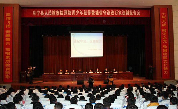 2月28日下午,阜寧中學在廣益講堂隆重舉行“預防青少年犯罪暨誠信守法進萬家”法制教育報告會。由鹽城市人民檢察院公訴科陶運梅科長率領的鹽城市預防青少年犯罪宣講團一行七人,給近千名同學上了一堂內(nèi)容豐富、生動活潑的法制教育課。