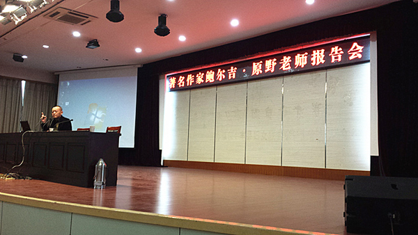 報告主要談學(xué)生作文和散文鑒賞,鮑爾吉·原野先生強調(diào)觀察和讀書積累的重要性。還講述了他在數(shù)九寒天買了一堆帽子到處尋找乞丐并贈送給他們的故事,并由此告訴學(xué)生們滿含著愛心去做自己喜歡的事情,給別人提供一點幫助,使自己快樂。他還告訴學(xué)生們讀書的方法,閱讀經(jīng)典作品而且要反復(fù)涵詠咀嚼。他還說寫作是一個人活一輩子當(dāng)中的小事,關(guān)鍵是要好好生活著,懷著愛心觀察和感受,才會生活得滿足。