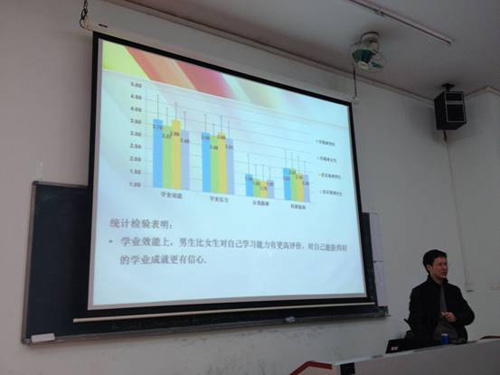 反饋分為兩個(gè)部分,第一部分由鄧博士對(duì)被測(cè)試同學(xué)的任課教師進(jìn)行結(jié)果反饋,第二部分則是對(duì)被測(cè)試的同學(xué)們進(jìn)行反饋。鄧博士詳細(xì)地介紹了測(cè)試的內(nèi)容以及對(duì)教育教學(xué)工作的重要指導(dǎo)意義,并將測(cè)試數(shù)據(jù)分析結(jié)果呈現(xiàn)給大家。他對(duì)學(xué)生在學(xué)習(xí)動(dòng)機(jī)、學(xué)習(xí)方法、影響因素等方面的測(cè)試結(jié)果做了詳盡的闡述,并根據(jù)我校區(qū)別于其他學(xué)校的數(shù)據(jù)專門做了針對(duì)性的分析和教育方法指導(dǎo)。最后,霍教授還對(duì)聽講的老師們?cè)俅螐?qiáng)調(diào)了科學(xué)測(cè)試的數(shù)據(jù)結(jié)果對(duì)我校拔尖創(chuàng)新人才培養(yǎng)的重要意義,希望大家能夠?qū)W會(huì)運(yùn)用數(shù)據(jù),找到規(guī)律,科學(xué)育人。