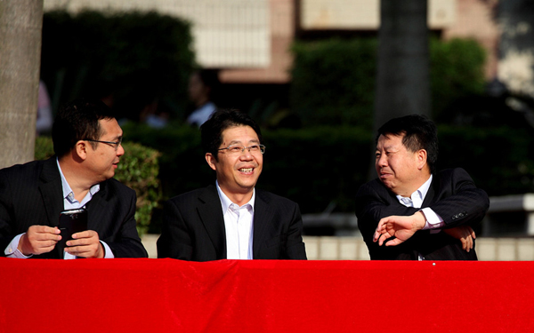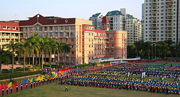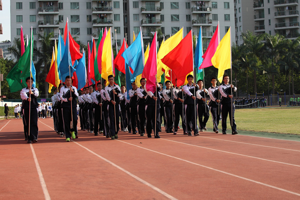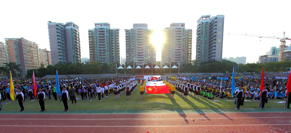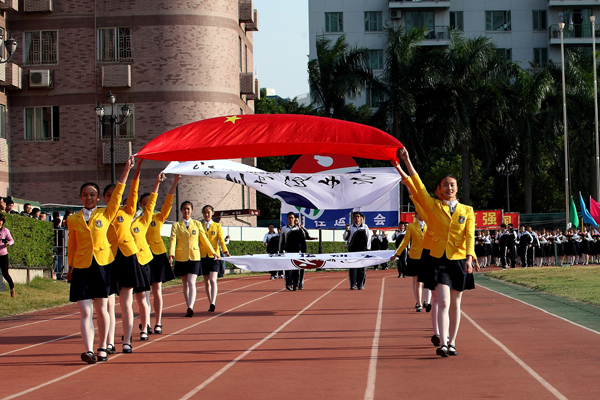 作為本次體育節(jié)重頭戲的田徑運動會在11月28日、29日兩天舉行。28日下午,開幕式在校本部操場舉行, 3點30分學(xué)生處龔衛(wèi)東主任宣布運動員入場,全校除高三外,其余共90個班級都參加了入場式的檢閱。檢閱中,國旗隊、校旗隊、會旗隊、宣傳牌匾隊、彩旗隊以及花束表演隊,依次通過大會主席臺進入場地。隨后是各班級運動員入場,每個班級都極盡創(chuàng)意,各顯神通,在隊形排列、服裝選擇、口號創(chuàng)作,甚至動作表演上都做了精心設(shè)計和編排,整個入場式場面熱烈,秩序井然。升旗儀式之后,李愛生副校長致開幕詞,運動員和裁判員代表分別宣誓。最后,黃顯甫校長在全校學(xué)生的歡呼聲中,宣布深圳市高級中學(xué)第十七屆田徑運動會開幕。