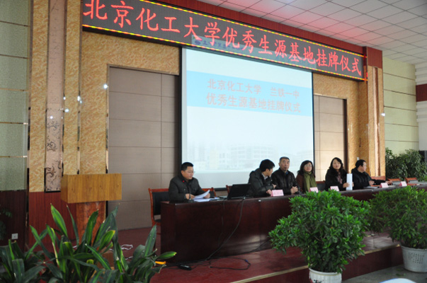 12月13日,北京化工大學(xué)優(yōu)秀生源基地掛牌儀式暨人才輸送協(xié)議簽署在我校三樓報(bào)告廳舉行。北京化工大學(xué)副校長(zhǎng)李顯揚(yáng)、北京化工大學(xué)招生辦主任趙靜、北京化工大學(xué)文法學(xué)院黨總支書記張亮、北京化工大學(xué)甘肅招生組長(zhǎng)王克儉、北京化工大學(xué)甘肅招生組副組長(zhǎng)宋保仁出席儀式。我校副校長(zhǎng)張潤(rùn)娥、楊玉良,教研室主任武慶文,教務(wù)處副主任蔡梅琳,校辦室副主任李學(xué)睿及相關(guān)老師、高二年級(jí)理科實(shí)驗(yàn)班學(xué)生參加儀式,儀式由楊玉良副校長(zhǎng)主持。