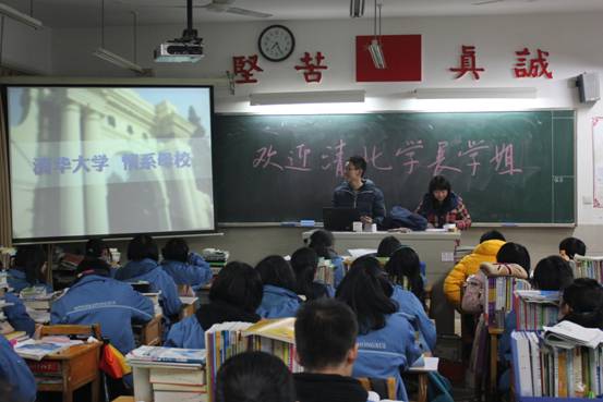 黑板上赫然幾個(gè)大字“歡迎清北學(xué)長(zhǎng)學(xué)姐指導(dǎo)學(xué)習(xí)”顯示出了學(xué)弟學(xué)妹們對(duì)這一次交流會(huì)的期待,而這一次交流會(huì)的開(kāi)展也是得益于清華大學(xué)的一項(xiàng)“情系母?!敝驹富顒?dòng)。該活動(dòng)由清華大學(xué)招生辦公室、共青團(tuán)清華大學(xué)委員會(huì)主辦,清華大學(xué)紫荊志愿服務(wù)總隊(duì)承辦,以“服務(wù)同學(xué)、回報(bào)母校、鍛煉自我、展示清華”為主旨,鼓勵(lì)在校大學(xué)生組隊(duì)返回高中母校,讓高中學(xué)生更好的了解名校風(fēng)物、走近名校學(xué)子,樹(shù)立學(xué)習(xí)的信心與目標(biāo)。