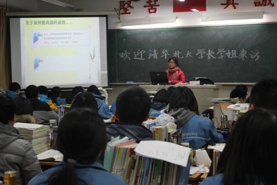 當(dāng)各位主講人走進(jìn)相應(yīng)的教室時(shí),掌聲如雷貫耳。文科班中,一段視頻《時(shí)光機(jī),清華園的延時(shí)攝影》勾起了在場(chǎng)同學(xué)對(duì)清華大學(xué)的向往,兩個(gè)文科生心目中的“大神”級(jí)人物劉士萌與張纖也講述了他們與清華北大的故事。劉士萌學(xué)長(zhǎng)著重向大家介紹了清華園里幸福而煩惱的生活,激起了大家對(duì)大學(xué)生活的無(wú)限憧憬,極大地激勵(lì)了大家的斗志?!皬拿鞯碌窖鄨@到底有多遠(yuǎn)?”張纖學(xué)姐提出了這樣一個(gè)同學(xué)們都十分關(guān)注,同時(shí)又引人深思的問(wèn)題,她說(shuō):“我到燕園的路途是一波三折的,但是,無(wú)論是一波幾折,只要擁有足夠的我信心與決心,付出了足夠的努力,路途就不再遙遠(yuǎn)”。在隨后的互動(dòng)環(huán)節(jié)中,同學(xué)們與學(xué)長(zhǎng)學(xué)姐交流了許多學(xué)習(xí)方面碰到的困難,也有同學(xué)提出了一些日常生活方面的問(wèn)題,學(xué)長(zhǎng)學(xué)姐都一一作了詳盡的解答。理科班中,公式的記憶方法,英語(yǔ)的學(xué)習(xí)方法,都得到了最細(xì)致的答復(fù)。學(xué)長(zhǎng)還向?qū)W弟學(xué)妹們贈(zèng)送了往屆學(xué)長(zhǎng)學(xué)姐對(duì)他們的寄語(yǔ)。