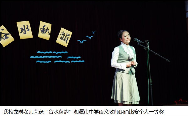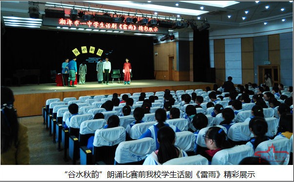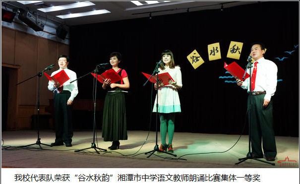 2013年10月18日上午,在我校百年紀(jì)念報(bào)告廳,“谷水秋韻”湘潭市中學(xué)語(yǔ)文教師朗誦比賽正精彩進(jìn)行。經(jīng)過(guò)緊張的比賽,我校代表隊(duì)榮獲比賽個(gè)人、集體一等獎(jiǎng),其中龍琳老師獲個(gè)人一等獎(jiǎng);章新華、鐘鐵牛、李曉紅、尹航老師獲集體一等獎(jiǎng)。比賽進(jìn)行前,我校學(xué)生還為參賽代表展演了課本劇《雷雨》。