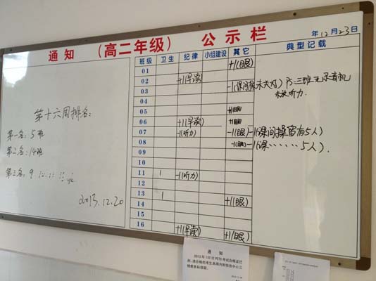 學生干部以三人為一組,每周一輪,每天從早到晚進行全年級巡查, 每天晚自習時間總結并公示檢查結果,每周五總結本周排名情況,每月底總結本月各班排名情況并對優(yōu)秀班級予以獎勵。