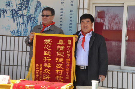 3月14日上午,愛(ài)心捐贈(zèng)活動(dòng)在司徒小學(xué)進(jìn)行。師大黨委常委王大勇、縣農(nóng)工委、明義鄉(xiāng)黨委書(shū)記、師大設(shè)備處、財(cái)務(wù)處、附小等單位領(lǐng)導(dǎo)、學(xué)校領(lǐng)導(dǎo)王昕校長(zhǎng)、柳文茂副校長(zhǎng)參加了捐贈(zèng)儀式。捐贈(zèng)儀式上,王昕校長(zhǎng)代表小學(xué)全體師生將3658冊(cè)課外讀物、273冊(cè)精裝語(yǔ)文周報(bào)送給司徒小學(xué)師生。司徒小學(xué)丁校長(zhǎng)向我校贈(zèng)送了錦旗,感謝我校小學(xué)師生的愛(ài)心捐贈(zèng)。