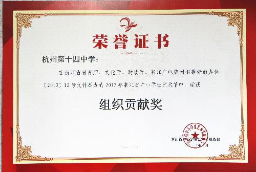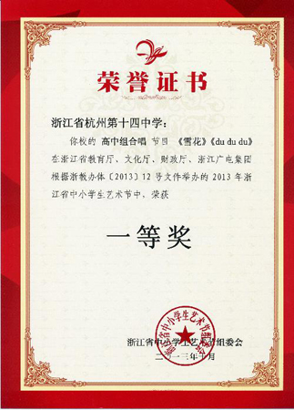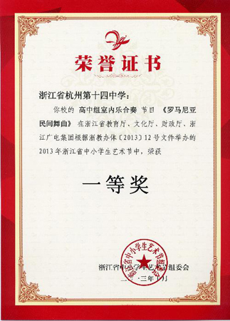 學(xué)校重視藝術(shù)教育,藝術(shù)成果豐碩。在浙江省中小學(xué)藝術(shù)節(jié)的比賽中,我校室內(nèi)樂團、合唱團表現(xiàn)突出,取得了優(yōu)異的成績,學(xué)校也獲得了組織貢獻獎。在此,對學(xué)校領(lǐng)導(dǎo)、指導(dǎo)教師、各團成員、各班主任以及所有關(guān)心支持藝術(shù)比賽的家長表示崇高的敬意和衷心的感謝,感謝大家為十四中在藝術(shù)方面做出的巨大貢獻!