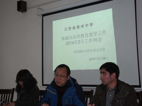 2014年2月28日下午,校新疆辦在新疆樓二樓會議室召開“新疆內(nèi)高班教育教學工作3月工作例會”。會議由朱衛(wèi)民主任主持,參加會議的有各年級分管內(nèi)高班的副主任、內(nèi)派老師等。會上新疆辦總結了2月份特別是寒假期間的工作,表揚了竇迎飛、胡浩老師在春節(jié)帶本班的新疆籍學生回家過年,也希望各班主任向王林和紀俊老師學習,春節(jié)期間經(jīng)常到學校看望本班新疆籍學生。內(nèi)派老師、年級領導就學生的學習、生活等情況做了交流。最后朱衛(wèi)民主任布置了3月份的工作。
