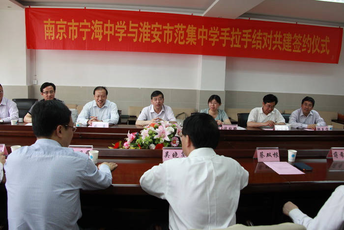 2014年5月21日,陽(yáng)光明媚,在這個(gè)美麗的時(shí)節(jié),在南京市、淮安市政府和教育主管部門的直接指導(dǎo)和關(guān)心下,南京市寧海中學(xué)與淮安市范集中學(xué)隆重舉行手拉手結(jié)對(duì)共建簽約儀式,參會(huì)領(lǐng)導(dǎo)和嘉賓共同見(jiàn)證了兩校攜手共進(jìn),共創(chuàng)未來(lái)的美好時(shí)刻!