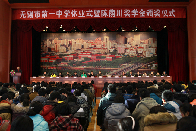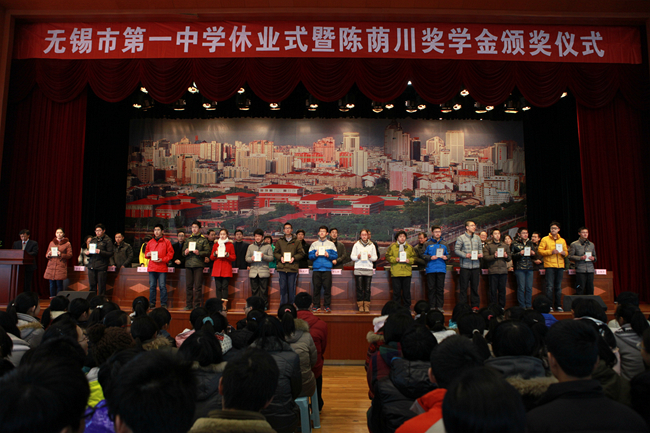 在1月23日的休業(yè)式上,無錫一中的兩千余名師生在校體育館舉行了第十三屆陳蔭川獎學(xué)金頒獎儀式?!瓣愂a川獎學(xué)金”是香港長江制衣集團(tuán)的創(chuàng)辦者陳氏家族,在2001年向我市慈善會捐資500萬元人民幣設(shè)立的,定向用于獎勵無錫一中表現(xiàn)突出的優(yōu)秀學(xué)生。儀式上,無錫市學(xué)校管理中心許立新主任、無錫一中陳江輝校長、以及學(xué)校其他主要領(lǐng)導(dǎo)、五大學(xué)科主教練為獲獎學(xué)生頒獎。本次獎項分為優(yōu)秀畢業(yè)生獎、競賽獎、學(xué)年獎、優(yōu)秀學(xué)生干部獎、三好生獎,共有900余名學(xué)生獲獎,人數(shù)為歷屆之最,獎金總額達(dá)40余萬元。