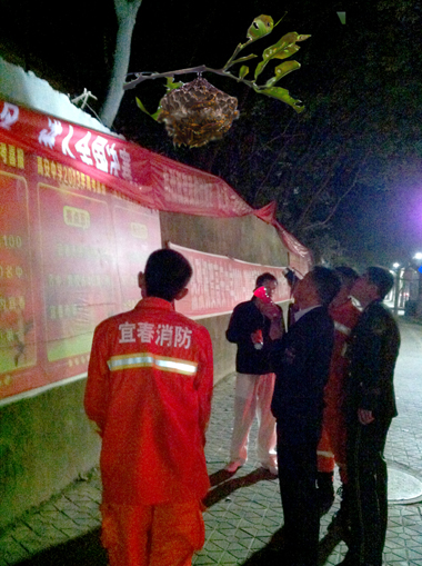 2013年11月2日晚上十點,高安中學老校保衛(wèi)科協(xié)助消防隊員成功搗毀位于小商店門口大樹上的一個巨大的馬蜂窩。這個水桶大的馬蜂窩形成時間約兩年,起初不大,且掛在離地面十六七米的樹上,被枝葉擋住,非常隱蔽,后被學校老師發(fā)現(xiàn)。老校保衛(wèi)科接到警情后非常重視,怕馬蜂蜇傷學校師生,兩次聯(lián)系高安市消防大隊,并和他們一起制定搗毀馬蜂窩方案,最終確定利用星期六晚上師生都不在校的時候搗毀馬蜂窩,盡量不要讓離巢的馬蜂蜇到師生及行人。老校保衛(wèi)科長李星在何雪平書記的指導(dǎo)下,帶領(lǐng)七位校衛(wèi)隊員協(xié)助消防員工作,并在靠近馬蜂窩的碧樂路兩端拉起了警戒線,經(jīng)過三個多小時的奮戰(zhàn),終于在11月3日凌晨一點搗毀馬蜂窩。成功解除安全隱患!