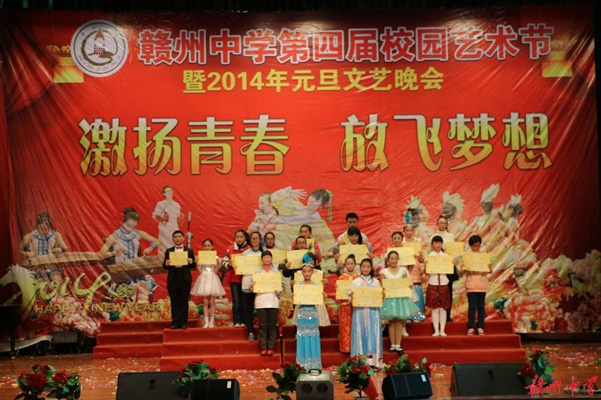 日月開新元,贛中換新顏。12月29-31日,我校在學(xué)校禮堂分年級(jí)隆重舉行第四屆文化藝術(shù)節(jié)暨2014年元旦文藝匯演,喜迎2014新年的到來。學(xué)校陳宗炫校長,黨總支郭強(qiáng)書記,副校長楊東冬、謝芳青、李瑞民,工會(huì)溫標(biāo)旗主席和5600余名師生以及部分家長觀看了演出并給予高度評(píng)價(jià)。