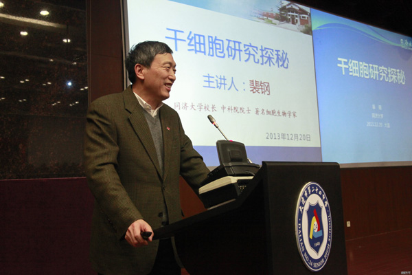 2013年12月20日下午,同濟(jì)大學(xué)校長(zhǎng)、中科院院士、著名細(xì)胞生物學(xué)家裴鋼教授,為大連市第二十四中學(xué)的學(xué)生作了題為《干細(xì)胞研究探秘》的報(bào)告。據(jù)悉,這是裴鋼教授第一次走進(jìn)高中進(jìn)行專業(yè)領(lǐng)域的講座。大連市副市長(zhǎng)朱程清、教育局副局長(zhǎng)鞠振偉、基教一處王學(xué)剛處長(zhǎng)、同濟(jì)大學(xué)大連校友會(huì)代表等出席了報(bào)告會(huì)。