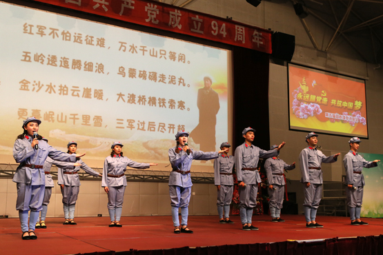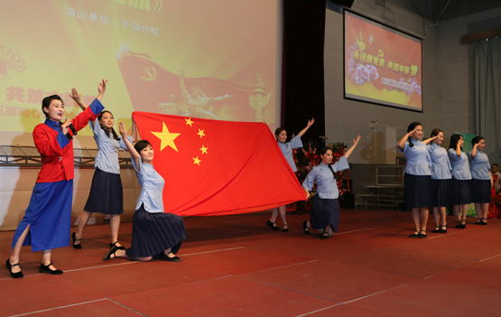 初中文綜合教研組教師的歷史講述拉開了詩歌會的序幕,帶領(lǐng)現(xiàn)場人員回顧了那段輝煌的建黨歷史,重溫了那些令人振奮的紅色記憶。本溪分校教師的《七律?長征》、五六年組學(xué)生的《漁家傲?反第一次大圍剿》《憶秦娥?婁山關(guān)》、七年組學(xué)生的《人民解放軍占領(lǐng)南京》、總校男教師的表演唱《保衛(wèi)黃河》、校舞蹈隊(duì)學(xué)生的舞蹈《閃閃紅星》《共產(chǎn)兒童團(tuán)團(tuán)歌》,以及于洪分校教師的舞蹈表演唱《繡紅旗》等節(jié)目氣勢磅礴,震撼人心,再現(xiàn)了從建黨初期到長征勝利、從抗日戰(zhàn)爭到解放戰(zhàn)爭的過程中,全國人民在中國共產(chǎn)黨的領(lǐng)導(dǎo)下艱苦奮斗的革命精神和豪邁氣勢,表達(dá)出全校師生及家長愛黨、愛國的信念和情懷,演員們動情的演出,感奮了全場觀眾。