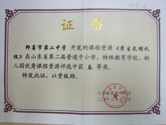 我校開發(fā)的課程資源《學生文明禮儀》在山東省第二屆普通中小學、特殊教育學校、幼兒園優(yōu)秀資源評選中獲三等獎。