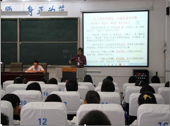 本次培訓(xùn)會由政教主任賴禎洋主持,校長盧前松做了“讓習(xí)慣合符規(guī)范,讓規(guī)范成為習(xí)慣”的主題報告。賴禎洋主任對十月讀書月活動做了具體的安排和要求。參加培訓(xùn)會的人員有全校各班的語文和英語課代表、班長、學(xué)校政教處的所有老師。