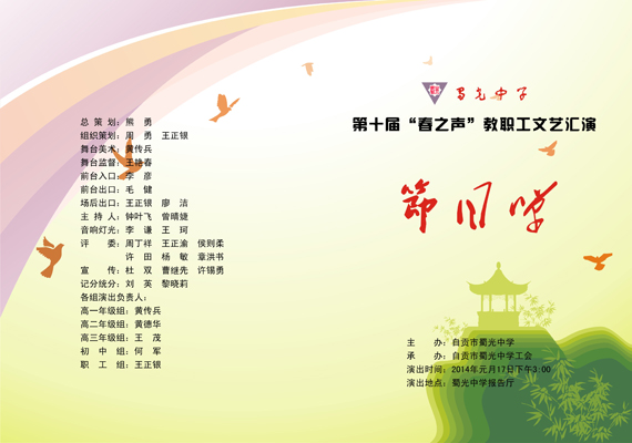 一年一度的蜀光中學(xué)“春之聲”教職工文藝匯演,于2014年1月17日下午3點在學(xué)校學(xué)術(shù)報告廳舉行。“春之聲”文藝匯演,是蜀光中學(xué)校園文化的一大亮點,迄今已經(jīng)舉辦了十屆,節(jié)目由全校教職工自編自演,注重節(jié)目品位,展現(xiàn)蜀光教師風(fēng)采,成為每年一度的保留節(jié)目,也是辛苦一年的全校教職工大聯(lián)歡。