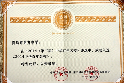 2014(第三屆)中華百年名校論壇暨第三屆《中華百年名校》發(fā)布會(huì)于2014年6月27日在清華大學(xué)文津國(guó)際酒店成功舉辦。論壇以“百年穿越與價(jià)值回歸”為主題,就“百年對(duì)一所學(xué)校意味著什么”、“百年文化的傳承與發(fā)展”、“百年前西學(xué)東漸對(duì)現(xiàn)代教育的影響”、“中國(guó)傳統(tǒng)教育思想對(duì)當(dāng)代教育的借鑒意義”、“競(jìng)爭(zhēng)環(huán)境中如何打造學(xué)校新的競(jìng)爭(zhēng)力”等議題進(jìn)行了深入討論。本次大會(huì)發(fā)布了《2014第三屆中華百年名?!访麊?,山東省青島第九中學(xué)成功入選。