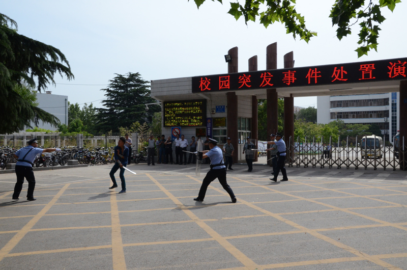 在市公安局鞠向群局長、市教育局張勇華局長的帶領(lǐng)下,泰安市公安局、局屬各支隊、各縣市區(qū)公安局和泰安市教育局、各縣市區(qū)教育局主要負(fù)責(zé)人及市直學(xué)校主要負(fù)責(zé)人共計60余人,在我校門口召開了此次現(xiàn)場會。大家首先聽取了警校共建、校園安保成績匯報,隨后觀看了防暴警械操作使用演示。鞠局長和張局長翻看了警校共建、校園安保方面的相關(guān)檔案材料,不時地詢問警校共建、校園安保工作中的好經(jīng)驗和好做法,并參看了省公安廳徐珠寶廳長到我校調(diào)研時的圖片和警校共建、校園安保宣傳展板。最后,與會人員在我校門外觀看了市公安局反恐支隊校園突發(fā)事件處置演練,通過觀看演練進一步提高學(xué)校應(yīng)對突發(fā)事件的能力。