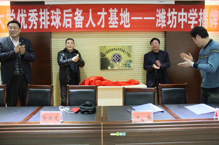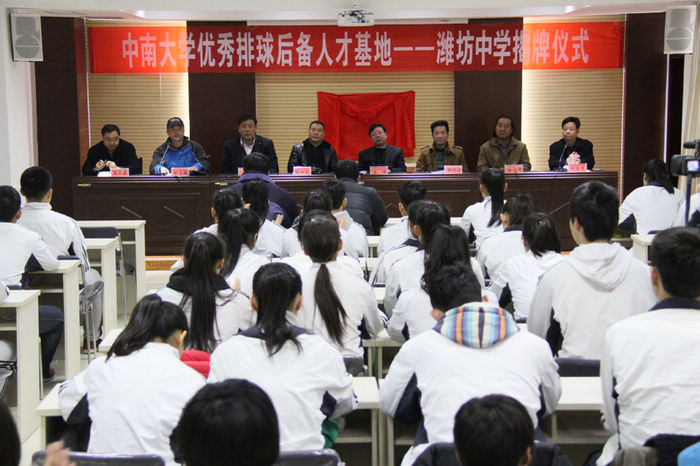 2013年12月30日上午,“中南大學(xué)優(yōu)秀排球運(yùn)動員后備人才基地揭牌儀式”在我校舉行。中南大學(xué)體育教研部部長喻躍龍、中南大學(xué)體育教研部副部長胡劍宏、中南大學(xué)體育教研部辦公室主任彭志偉、濰坊中學(xué)校長、黨委書記王偉、濰坊市體育運(yùn)動學(xué)校校長王萬勝、濰坊中學(xué)副校長孟令森、濰坊市田徑管理中心主任徐文濤、濰坊中學(xué)排管中心主任陳會泉出席了揭牌儀式。濰坊中學(xué)藝體部主任劉玉泉主持了會議。