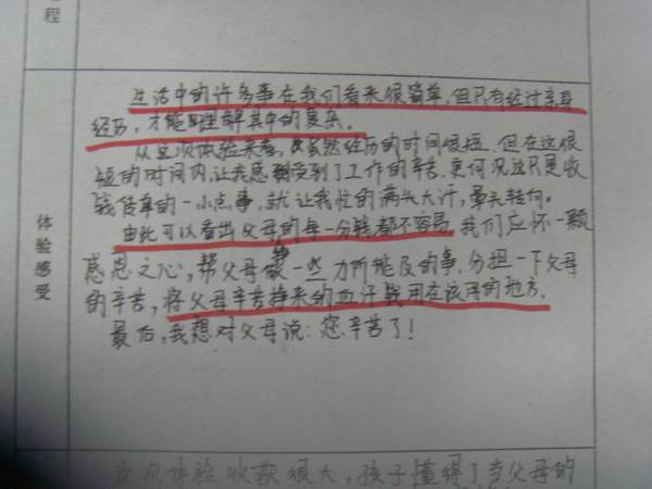 本次活動(dòng)主要是通過引導(dǎo)學(xué)生進(jìn)行父母職業(yè)體驗(yàn),體會(huì)父母工作的辛苦,掌握父母職業(yè)的基本技能,讓學(xué)生樹立正確的社會(huì)實(shí)踐觀念,學(xué)會(huì)處理體驗(yàn)過程中的突發(fā)事件、安全問題,學(xué)習(xí)與人交往合作。