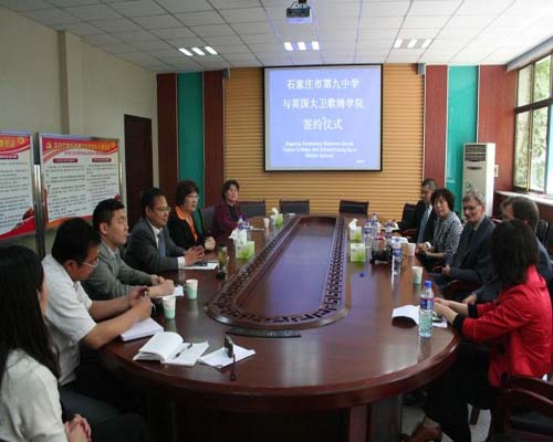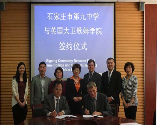 九中校長(zhǎng)周軍山與英國(guó)大衛(wèi)歌姆學(xué)院校長(zhǎng)David 先生共同簽屬了友好學(xué)校備忘錄,石家莊市僑聯(lián)胡翎主席及教育廳領(lǐng)導(dǎo)參加了友好學(xué)校簽屬儀式,胡翎主席就兩校今后合作給了一些指導(dǎo)性建議。