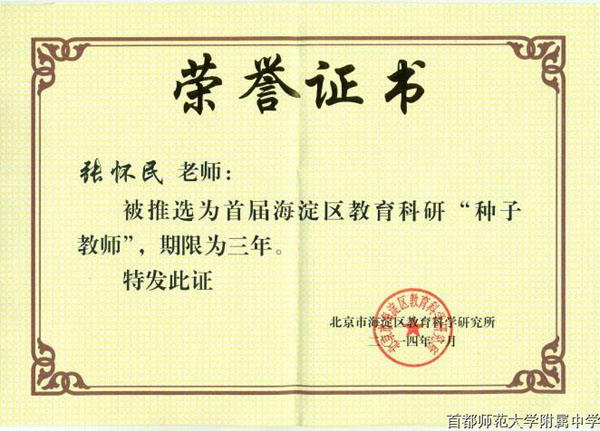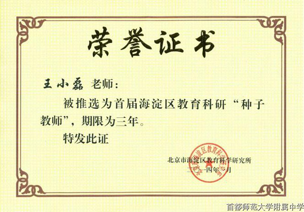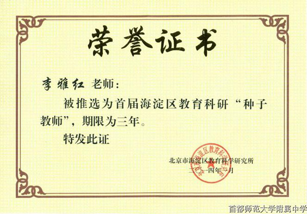 經(jīng)過個人申請,學校審核后推薦上報,然后由區(qū)教科所統(tǒng)一組織評選,我校王小磊、張懷民、李雅紅三位教師被推選為海淀區(qū)教育科研“種子教師”。特向以上三位教師表示熱列祝賀!同時,也希望借此契機,促使更多教師走上學術化和專業(yè)化的發(fā)展道路。