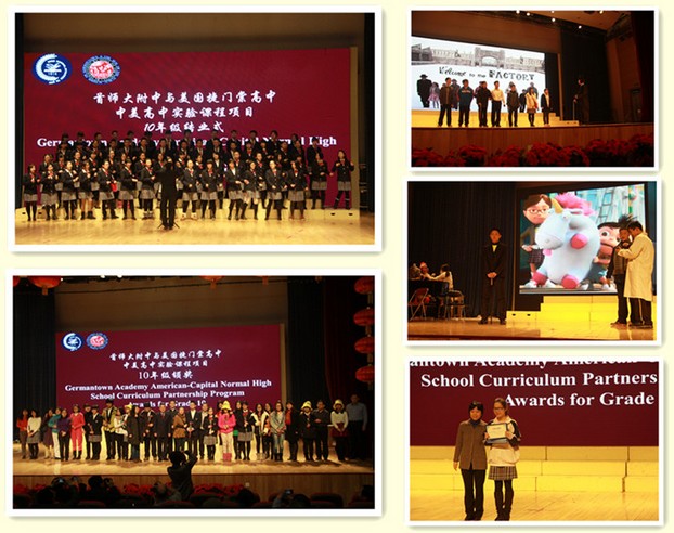結(jié)業(yè)式共分為六個環(huán)節(jié),第一個環(huán)節(jié)——林洋老師指導的Sing in the rain英文混聲合唱拉開了整個結(jié)業(yè)式的序幕,學生們高中低聲部配合默契,鋼琴長笛伴奏和諧,特別設計的肢體動作彰顯了青春的活力。尤老師制作的學期活動視頻展示,讓孩子們憶起了那即將逝去的一學期的點點滴滴,也讓家長們看到了孩子們在學校里豐富多彩的另一面生活。第二個環(huán)節(jié)——全體學生分為19組每人一個角色對電影片段進行了表演。一周的時間需要揣摩人物性格,背誦大段臺詞,準備服裝道具,打磨每一句臺詞的語氣、眼神和動作。排練雖然緊張,但絲毫沒有影響同學們投入演出的熱情,根絕角色需要許多同學主動要求一人飾多個角色。演出當天家長和老師們看著學生在舞臺上大方而有激情的演出,自信而流暢的口語表達,都感到由衷的欣慰。第三個環(huán)節(jié)——外教老師精彩點評,對孩子們出色的表演給予了很高的評價;第四個環(huán)節(jié)——家長為自己的孩子上臺獻花,這不僅讓家長主動的參與到了本次活動,同時也通過家長的肯定大大鼓勵了學生,增強了親子關(guān)系。第五個環(huán)節(jié)——馬德玲主任為本學期學習成績表現(xiàn)突出以及取得進步的學生頒發(fā)獎狀,鼓勵獲獎學生們不驕不躁、繼續(xù)努力,其他的同學迎頭趕上,找到下學期學習目標。最后一個環(huán)節(jié)由梁宇學副校長對學生對本次活動進行了點評,并對接下來的一個學期提出了希望,為本次活動畫上了一個圓滿的句點。