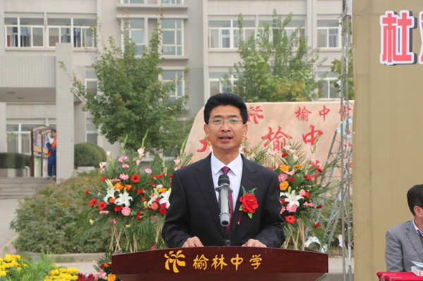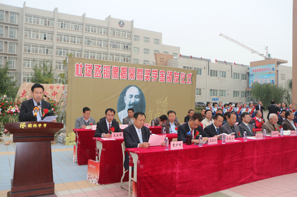 9月30日上午,杜斌丞先生銅像揭幕儀式在我校斌丞廣場舉行。民盟中央秘書長高栓平,原中共陜西省委政法委書記、杜斌丞教育思想研究會副會長霍世仁,中共榆林市委常委、榆林市人民政府常務(wù)副市長高中印,原榆林地區(qū)人大工委主任、杜斌丞教育思想研究會顧問黃文選,民盟陜西省委副主委馬玉紅,榆林市政協(xié)副主席麻寶玉,浙江正泰公益基金副理事長兼秘書長胡勇耀,原中國民航華北局副局長、杜斌丞教育思想研究會顧問馬曉文,榆林市人民政府副秘書張耀民,榆林市教育局局長常少明。市委統(tǒng)戰(zhàn)部、省市民盟有關(guān)領(lǐng)導(dǎo),杜斌丞先生的親屬及家鄉(xiāng)代表,杜斌丞獎(jiǎng)學(xué)金獲獎(jiǎng)學(xué)校獲獎(jiǎng)單位的領(lǐng)導(dǎo)和學(xué)生代表參加了儀式。儀式由副校長高玉峰主持。