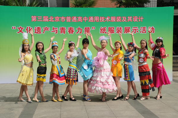 2014年4月26日, 我校通用技術教師王雅炯、強建平和李澤深帶領譚孟琪、范子淳、郭曉玥、宋冰潔、張霖、張攀、舒予、葉思卿、鄭昱含、眭妍、蔣一芃、趙田格格、許澤君、于雪詩、孫瑾漪、吳曉雪、王玉婷、吳曉嘉、蘭溪等22名人,參加了在北京師范大學附屬實驗中學舉辦的由北京教科院基礎教育教學研究中心組織的“第三屆北京市普通高中通用技術服裝及其設計展示”活動,本次活動共有來自北京市、天津市、深圳市、大連市普通高中的29所學校代表隊600余名師生參加。我校參加展示的五組10套帶有阿里山族、藏族、阿瓦族、維吾爾族、漢族特色的紙藝盛裝,在《阿里山的姑娘》、《天路》、《阿瓦人民唱新歌》、《我們新疆好地方》、《愛我中華》5首大家耳熟能詳、又具有民族特色的樂曲連奏下,身著紙藝盛裝的靚麗模特,載歌載舞的真情演繹,令人耳目一新,取得了非同凡響的展示效果,榮獲團體二等獎。王雅炯、強建平、李澤深三名教師獲得優(yōu)秀指導教師獎,同時參加設計制作和展示的同學分別獲得了設計一等獎、二等獎和優(yōu)秀模特獎。