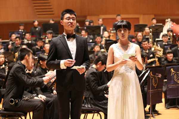 當(dāng)晚,能容納千人的音樂廳賓朋滿座,我校部分全體教職工、各班部分學(xué)生代表、家長(zhǎng)代表早早來(lái)到音樂廳,興奮的等待著激動(dòng)的時(shí)刻的到來(lái)。在黨委于文坤書記的音樂會(huì)致辭后,舉行了簡(jiǎn)短的贈(zèng)匾儀式。著名簡(jiǎn)帛體書法家王巍為本次盛會(huì)親獻(xiàn)墨寶“春之聲”,他帶領(lǐng)30名弟子親自出席音樂晚會(huì)并向我校贈(zèng)送了題字牌匾。整臺(tái)節(jié)目共有十一首曲目,分別由我校音樂教研組組長(zhǎng)、管樂團(tuán)團(tuán)長(zhǎng)王圣杰,音樂教師、管樂團(tuán)副團(tuán)長(zhǎng)朱輝,青年指揮焦子傲擔(dān)任。在場(chǎng)的每一位聽眾都被悠揚(yáng)的樂曲、團(tuán)員用心吹奏的狀態(tài)、同學(xué)們?cè)鷮?shí)的功底感動(dòng)著,在指揮的帶動(dòng)下,聽眾們隨著優(yōu)美的旋律,時(shí)而屏息靜聽,時(shí)而歡快擊掌,現(xiàn)場(chǎng)氣氛激動(dòng)人心。