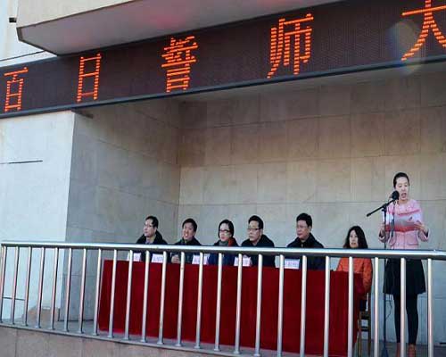 莊嚴的升旗儀式拉開了大會的序幕。首先,高三教師武曉章作為教師代表發(fā)言,他用抑揚頓挫的演講為同學(xué)們備戰(zhàn)高考加油鼓勁。其次,高三珍珠1班陳凡作為學(xué)生代表向全體高三學(xué)生發(fā)出了“青春動員令”,號召大家珍惜時間,超越自己,為母校爭光,再創(chuàng)開一輝煌。再次,高三全體師生分別宣誓。忠于職守、風(fēng)雨同舟,教師們?yōu)閷W(xué)生高考保駕護航,讓學(xué)生夢想成真,表達了再創(chuàng)學(xué)校高考輝煌的信心;學(xué)生們用慷慨激昂的話語表達出為夢想拼搏的決心。一位家長代表送來了全體高三學(xué)生家長的共同祝福,祝愿孩子們都能成為高考的勝利者。張麗鈞校長更是心系高三學(xué)子,她的發(fā)言既文采飛揚,又語重心長,這份深深的囑托讓高三全體師生熱血沸騰,斗志昂揚。最后,高一、高二年級的全體同學(xué)在張朝輝校長的帶領(lǐng)下用雄壯的吶喊為高三師哥師姐加油助威,送上了他們的誠摯祝福。